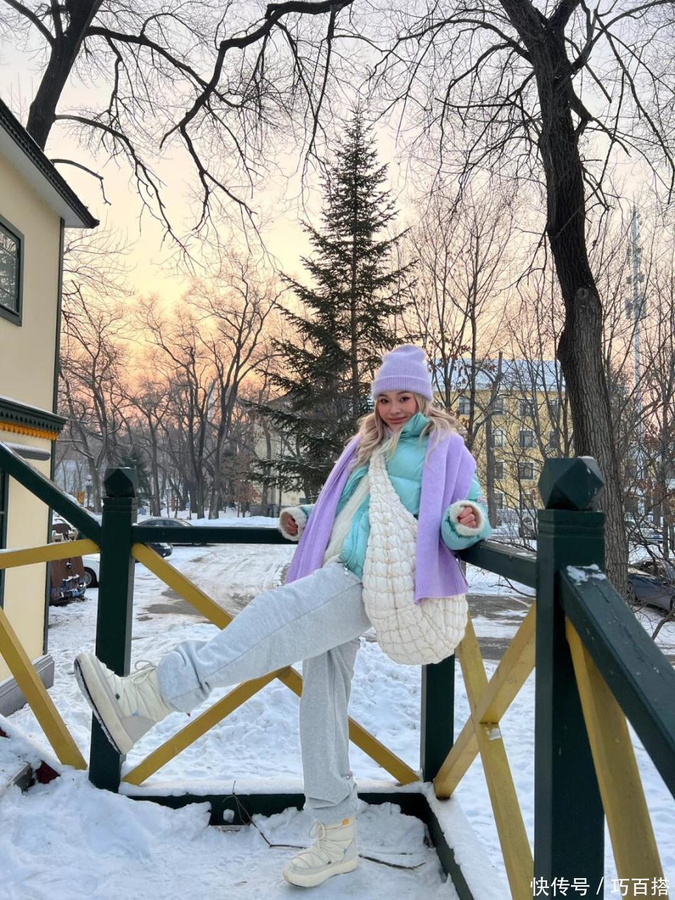 二,大家也可以选择与雪地颜色有明显区别的配色,比如博主身上这类低饱和度的卡其色和水洗蓝,淡粉色和苹果绿色外穿出门效果也很nice。