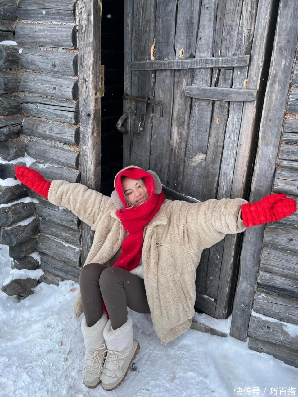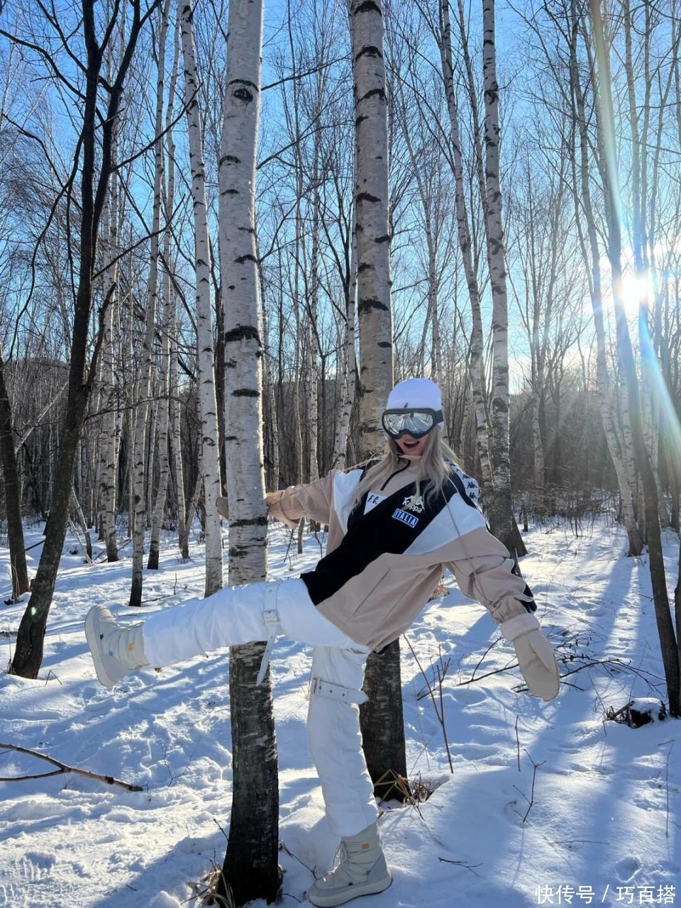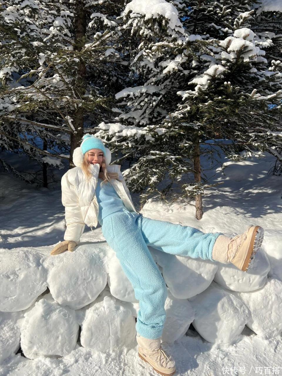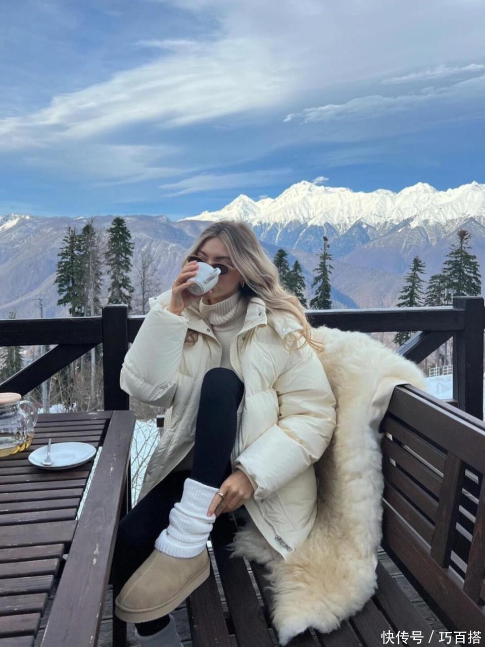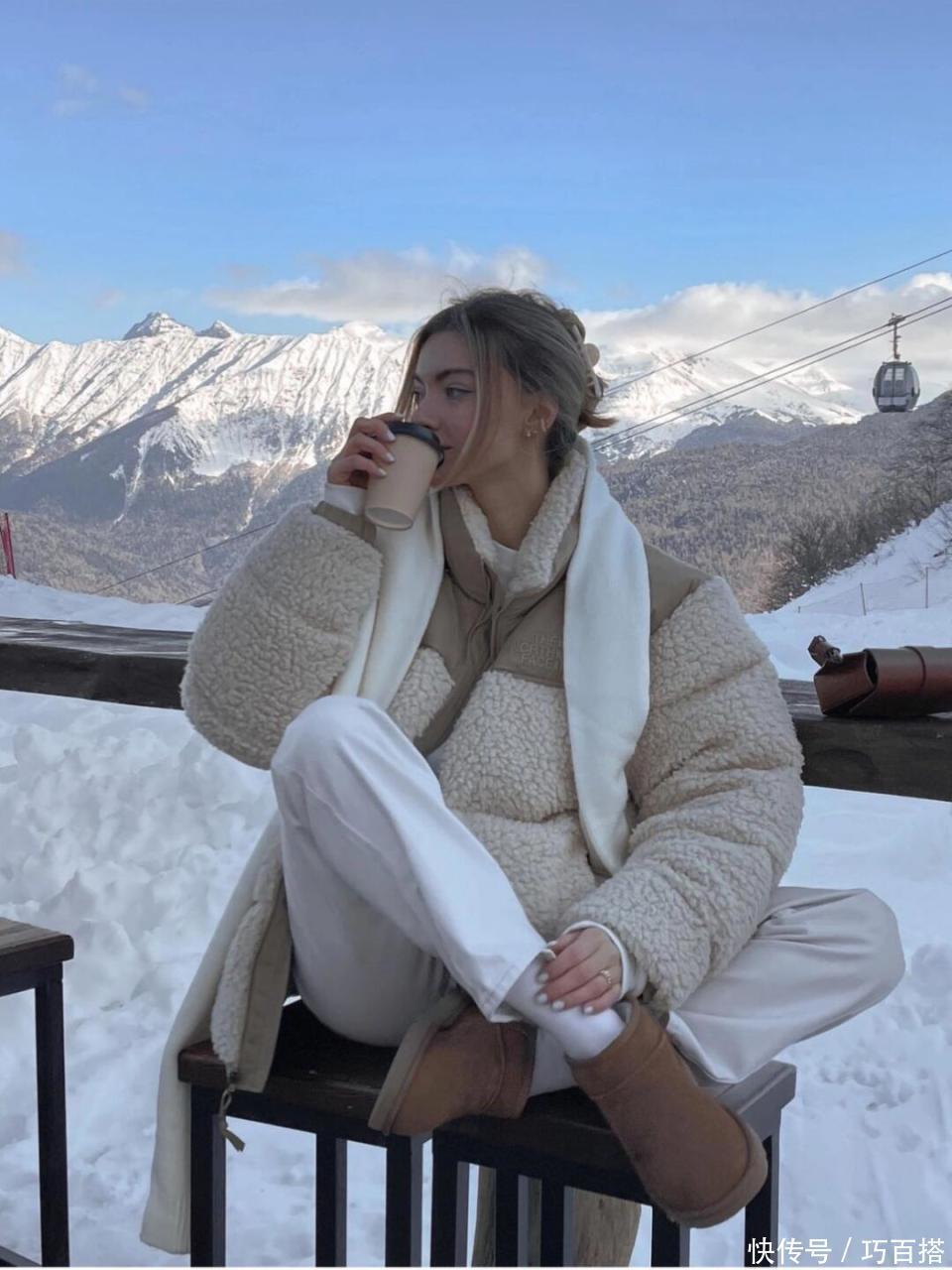 一,选择与雪地颜色相近的清新淡雅的乳白色或者米白色类造型,整体单品清爽、迷人,宛如雪地精灵,仙美灵动。